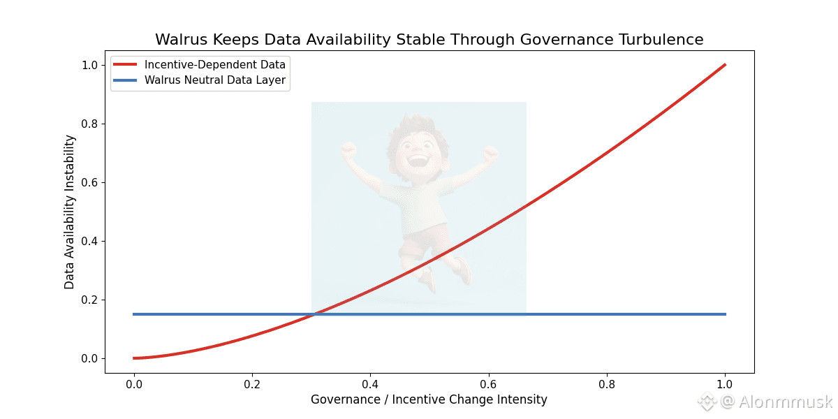 In modular blockchain architectures, governance often operates at the execution or application layer. Validators vote. Protocols upgrade. Rules are amended. Data, however, sits beneath these decisions. It must remain accessible regardless of which direction governance takes. When availability depends on current incentives or prevailing narratives, it becomes vulnerable to shifts in sentiment. Walrus exists to insulate data availability from these cycles.
