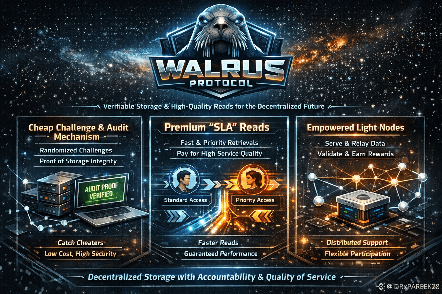 Walrus is therefore best understood as a protocol that treats decentralization as only the baseline. The real challenge is trust without trust, performance without centralization, and incentives without exploitation. Cheap challenge mechanisms force accountability without harming scalability. Premium read options translate performance into a rational market signal. Light node empowerment expands the contributor base, multiplying both robustness and read availability. In combination, these ideas shape a forward-looking storage system where verification is continuous, retrieval is service-grade, and participation is genuinely open to everyone—from large providers down to the smallest lightweight clients. This is the direction that makes Walrus Protocol not just another storage layer, but a blueprint for decentralized infrastructure that can survive both adversarial behavior and real-world user expectations.