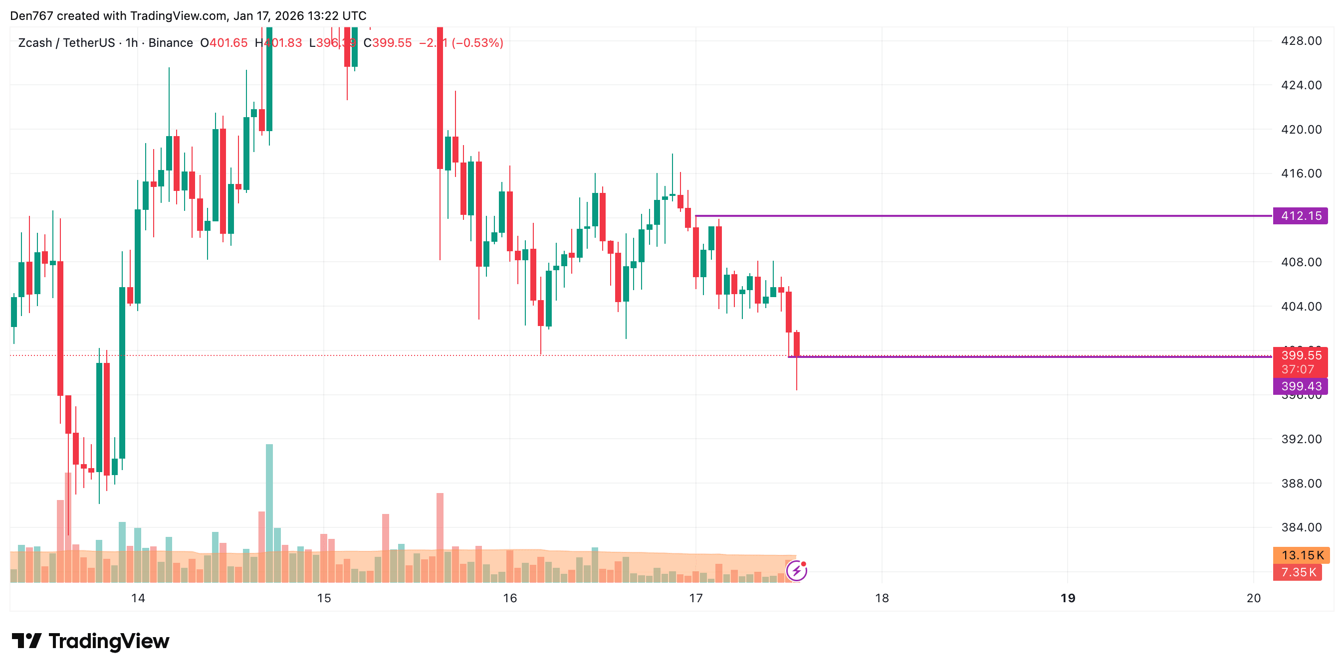 No gráfico horário, a taxa de ZEC está parecendo baixista. Se uma quebra do suporte local em $399.43 acontecer, a queda provavelmente continuará na zona de $390 em breve.