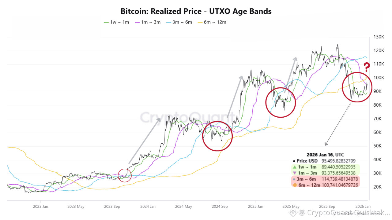 When we analyze Bitcoin through Realized Price by age bands, we are not searching for trend signals. We are mapping where psychological stress is accumulating across holders.
