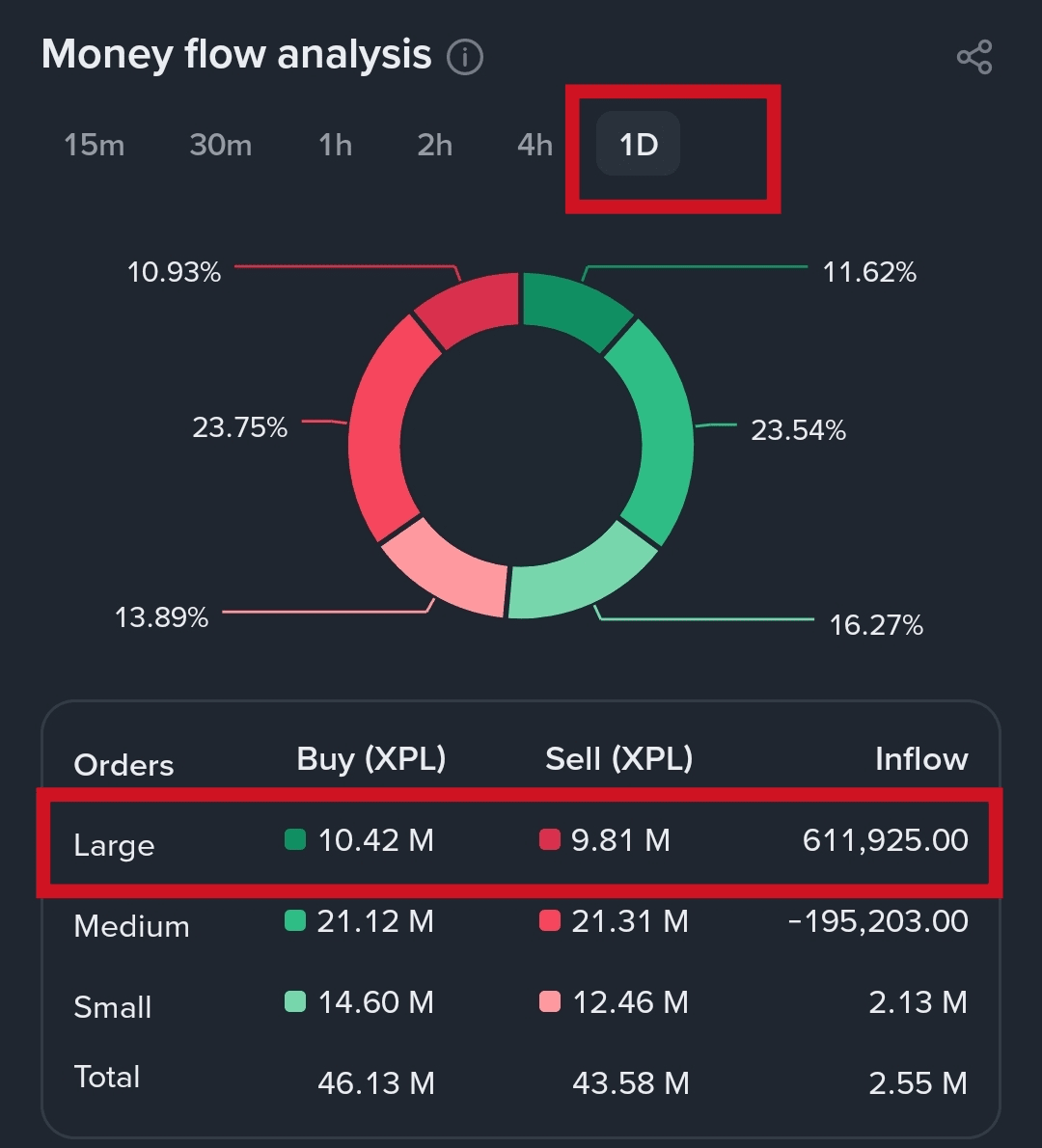 XPL, por outro lado, esteve em uma zona de consolidação por várias semanas e parece pronto para um rompimento em breve... Os dados de análise de fluxo de dinheiro da Binance mostram que investidores e traders estão comprando mais tokens $XPL do que estão vendendo.