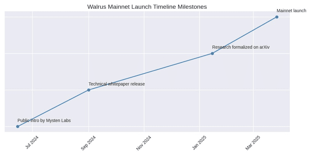 De uma perspectiva de trader/investidor, o maior sinal não foi a marca. Foi o timing e a entrega. A Walrus publicou um whitepaper técnico em setembro de 2024 explicando sua arquitetura e abordagem de eficiência, e depois formalizou a pesquisa no arXiv em 2025. Então, o verdadeiro marco chegou: a Walrus foi lançada na mainnet em 27 de março de 2025, passando de reivindicações de armazenamento experimental para um sistema ao vivo onde o armazenamento e a recuperação estão realmente acontecendo em condições de produção.