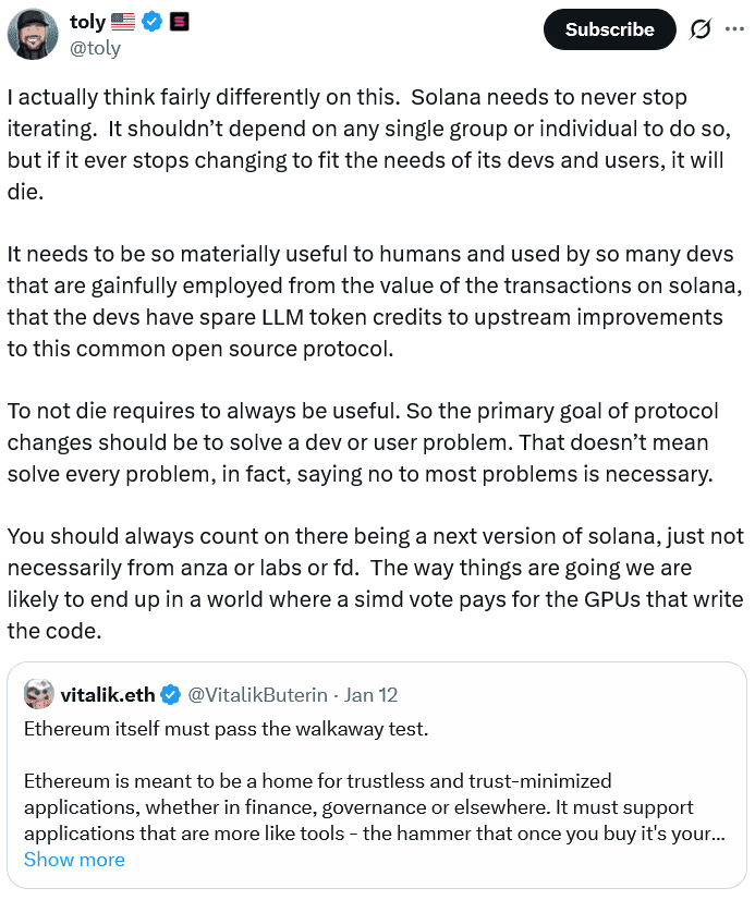 O CEO da Solana Labs, Anatoly Yakovenko, disse que quer que a Solana seja uma rede em constante evolução, atualizando continuamente para atender às necessidades em mudança dos usuários, contrastando com a visão de Vitalik Buterin de Ethereum como uma blockchain autossustentável.