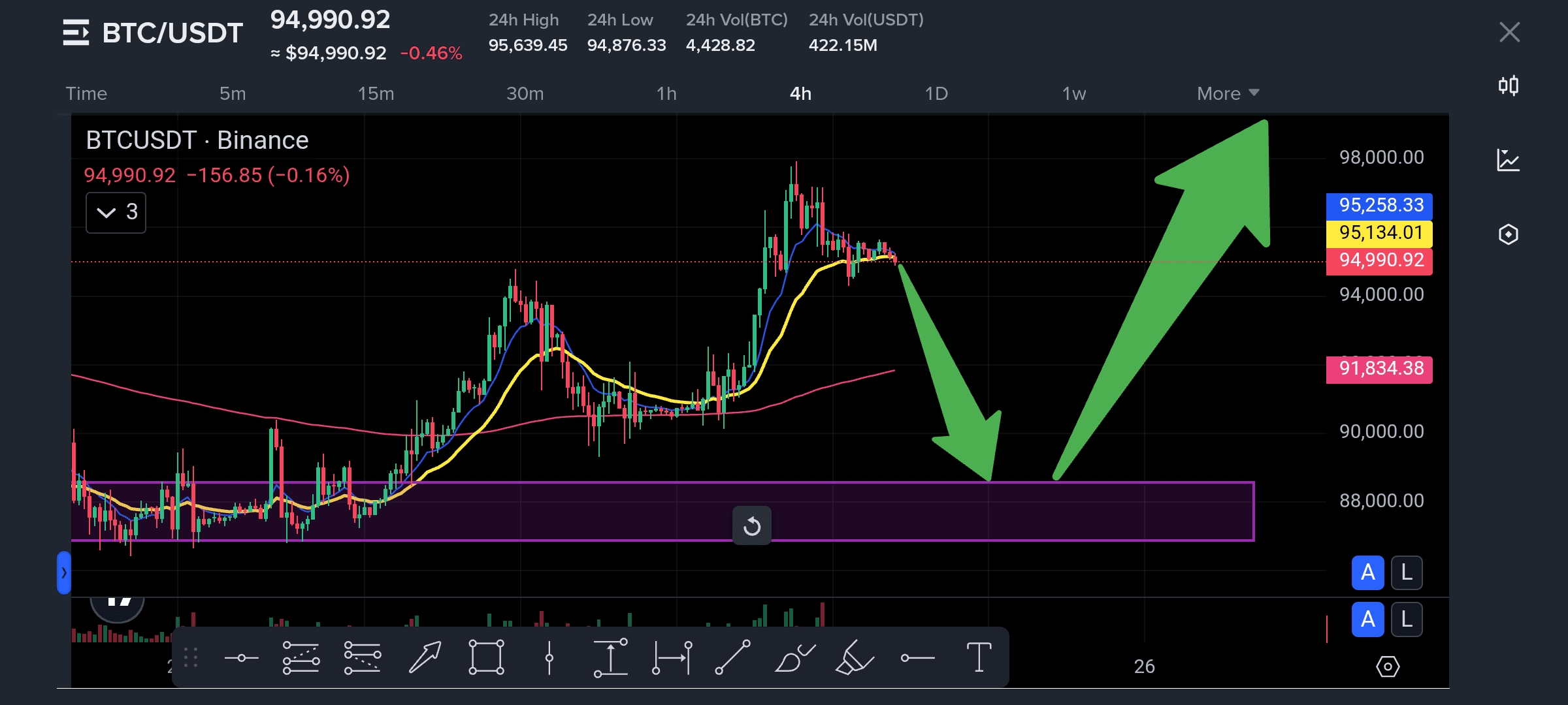 No diário, o suporte real está muito mais baixo, em torno de 88 – 90k