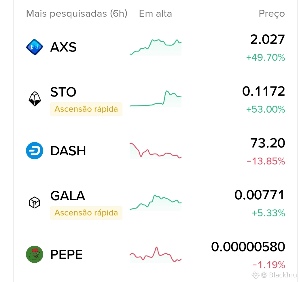 As moedas mais pesquisadas nas últimas 6 horas mostram movimentos intensos. AXS lidera com alta de 49.70%, negociada a 2.027 USDT. STO segue com impressionantes 53.00%, cotada a 0.1172 USDT.