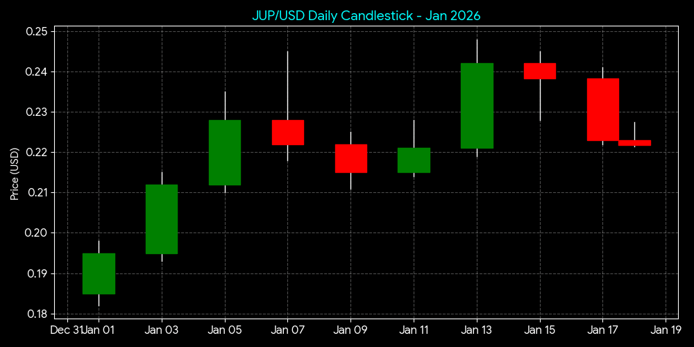 A JUP recentemente rompeu uma tendência de queda de médio prazo. Tem um forte suporte em $0.210 e enfrenta resistência significativa em $0.245.