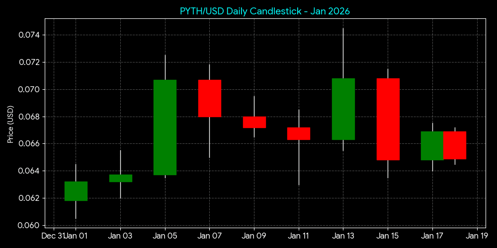Neutro-Bullish. PYTH viu uma tendência de crescimento de 5% durante a primeira metade de janeiro. O preço está atualmente em torno de $0.0649.
