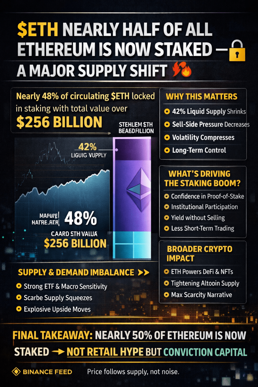De acordo com os dados da Ethereum Beacon Chain, quase 48% do total em circulação $ETH do fornecimento está agora bloqueado em staking, com o valor total apostado excedendo $256 BILHÃO. Isso não é apenas um marco — é um choque fundamental de fornecimento.
