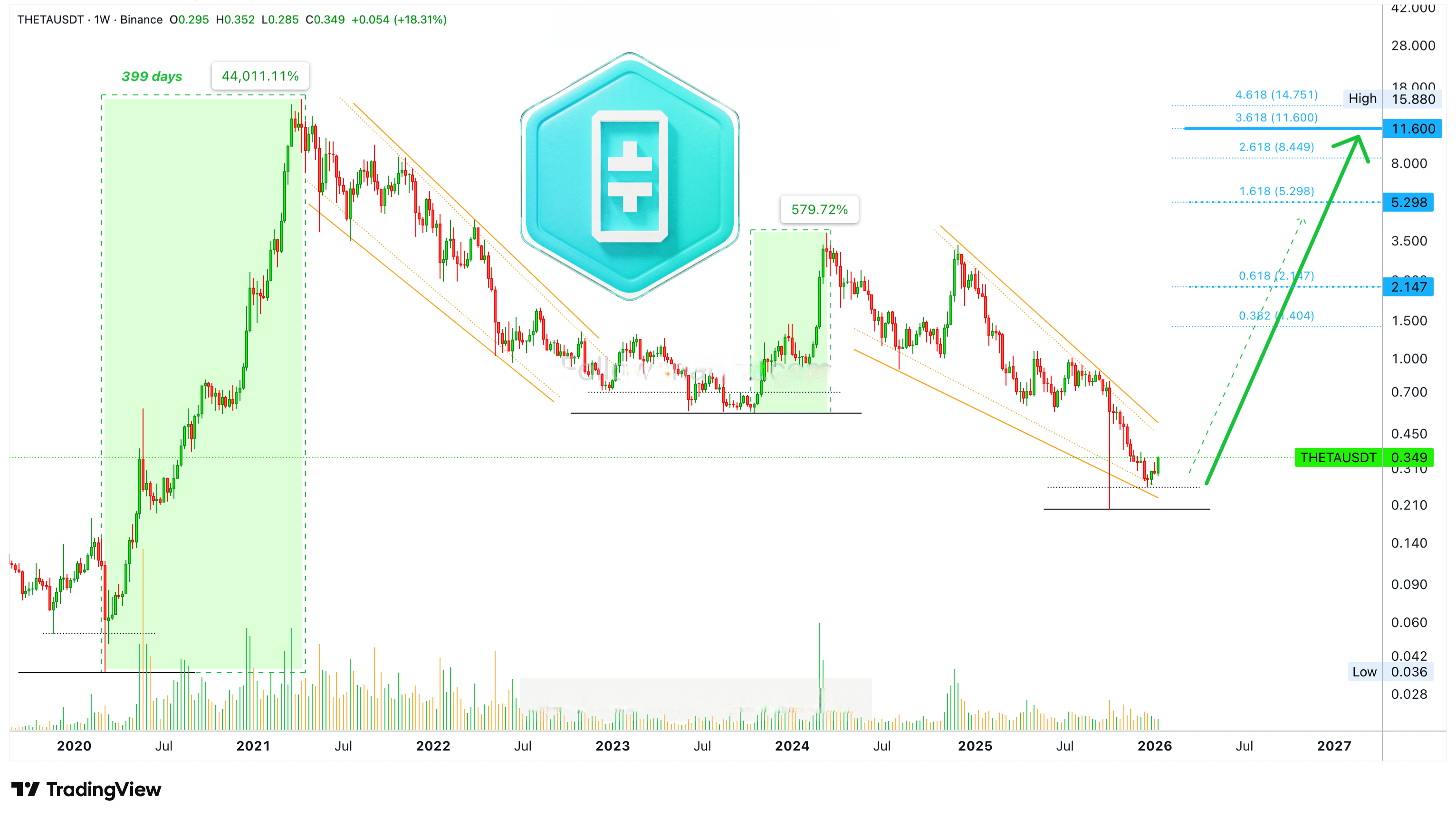 Pensamento claro. THETAUSDT cresceu 44.000% em 399 dias. De março de 2020 a abril de 2021.