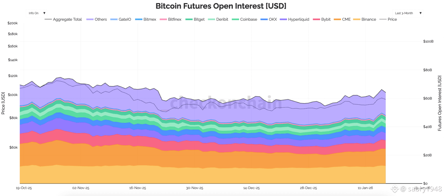 تبدو الفائدة المفتوحة في العقود الآجلة خلال الفترة نفسها أكثر استقراراً وزيادة تدريجية، مما يعكس سوقاً تُعدل فيه المراكز باستمرار، بدلاً من أن تُصفى آلياً بانتهاء الصلاحية. هذا الاختلاف يفسر لماذا يمكن للخيارات تجاوز العقود الآجلة حتى عندما يكون السعر متقلباً والثقة مختلطة.
