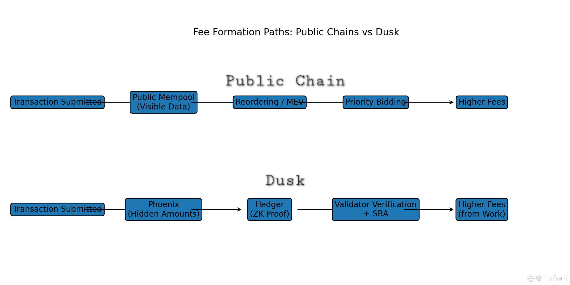Hedger sits right in the middle of this. Every DuskEVM transaction that needs privacy gets turned into a proof. Validators have to verify that proof before SBA can finalize the block. So when demand goes up, fees go up because more cryptographic work is being done. Not because someone waved a bigger number to jump the line.