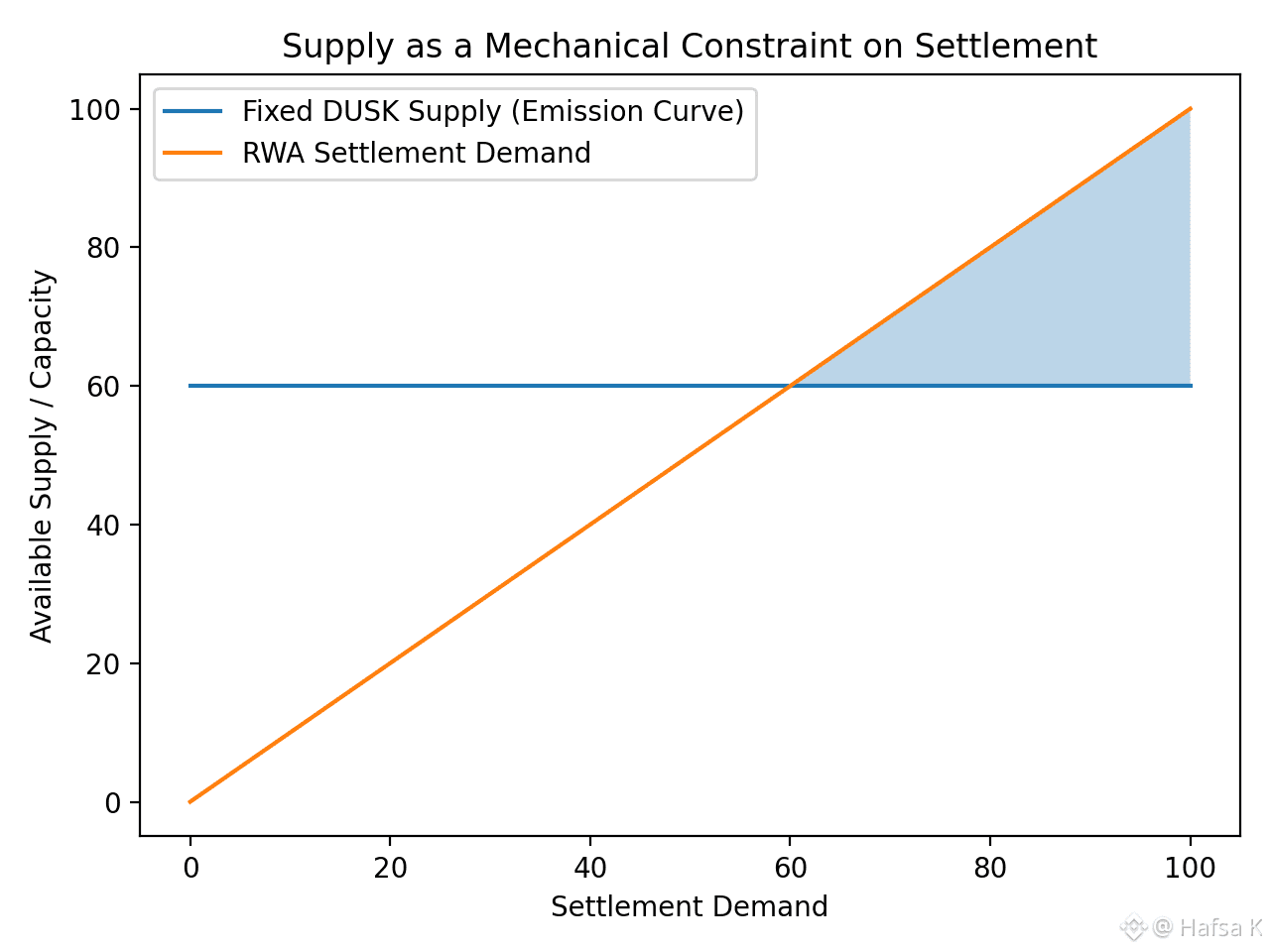 The network looks quiet most of the time. Blocks finalize. Committees rotate. Nothing dramatic. But the mechanics are already there. If RWA volume grows from hundreds of millions to billions, Dusk doesn’t need to change how it works. Demand presses against a supply curve that was never meant to bend quickly.