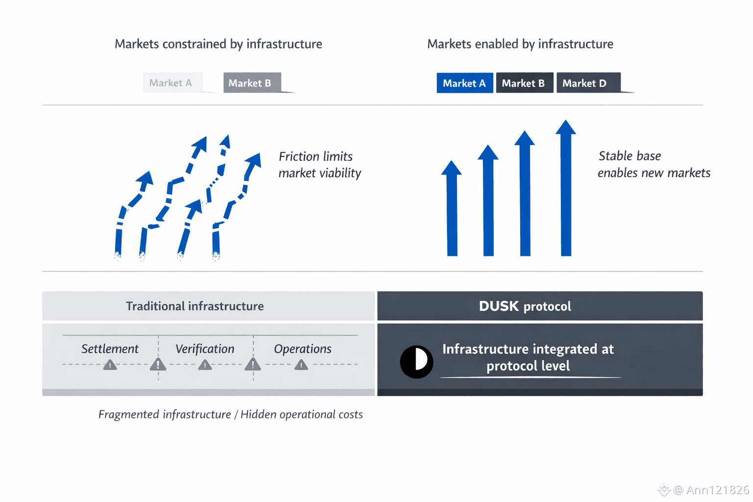 DUSK cambia este punto de partida. Al integrar la lógica financiera directamente en el protocolo, la infraestructura deja de ser un obstáculo que debe compensarse con procesos adicionales y se convierte en una base estable sobre la cual pueden construirse mercados más complejos sin que el costo operativo crezca de forma desproporcionada. No se trata de optimizar un flujo existente, sino de habilitar flujos que antes no eran sostenibles desde el punto de vista operativo.