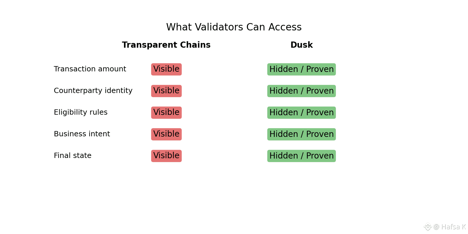 What makes this work in practice is Hedger. Hedger sits between DuskEVM execution and the settlement layer, translating smart contract logic into proofs that Phoenix and Moonlight can enforce privately. Validators never see mempool intent. They never see trade size. They never see liquidation thresholds. They verify correctness and finalize state. That blindness matters. On transparent PoS chains, validators and searchers extract value precisely because they can see everything. On Dusk, there’s nothing to extract.