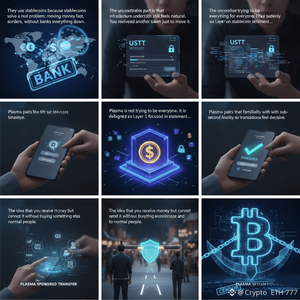 If you watch how people actually use stablecoins in real life, the pattern is very simple. They are not here for ideology, they are not here for tech debates, and they are definitely not here to learn how blockchains work. They use stablecoins because stablecoins solve a real problem: moving money fast, across borders, without banks slowing everything down. But the uncomfortable part is that the infrastructure underneath still feels unnatural. You receive USDT and suddenly you need another token just to move it. Fees change. Transactions feel uncertain. For normal users, that breaks trust instantly. This is exactly the gap Plasma is trying to fix, not by adding more features, but by removing friction where it hurts the most. Plasma is not trying to be everything for everyone. It is deliberately designed as a Layer 1 focused on stablecoin settlement, and that focus shapes every technical and user-facing decision it makes. Instead of treating stablecoins as just another token on a general-purpose chain, Plasma treats them as the main product. That single shift changes everything. The chain is EVM compatible so developers do not have to relearn tools or abandon existing ecosystems. Smart contracts behave in familiar ways, wallets work as expected, and integration costs stay low. This matters because payments infrastructure does not grow through novelty, it grows through reliability and compatibility. Plasma pairs that familiarity with sub-second finality so transactions feel decisive. When someone sends money, they do not want to wait and wonder. They want to know it is done. Fast finality reduces hesitation for users, lowers operational risk for merchants, and makes onchain settlement feel closer to everyday digital payments rather than speculative crypto activity. One of the most human problems Plasma addresses is gas. The idea that you can receive money but cannot send it without buying something else is irrational to normal people. Plasma’s gasless USDT transfers are built around this reality. Basic stablecoin transfers can be sponsored so new users are not blocked at the door. This is not about giving away free transactions forever. It is about making the first experience feel natural. Guardrails, limits, and eligibility checks exist so the system stays sustainable, but the core idea remains simple: if someone has stablecoins, they should be able to use them. Beyond that first step, Plasma introduces stablecoin-first gas so users and businesses can pay fees in the same asset they are already using. Psychologically this is huge. Fees stop feeling like an unpredictable tax in a volatile token and start feeling like a small, understandable cost in dollars. For businesses and institutions, this also simplifies accounting, treasury management, and forecasting. Predictability matters more than cheapness when real money is involved. Plasma’s security model adds another layer to this trust by anchoring parts of its state to Bitcoin. This is not about competing with Bitcoin or turning it into something else. It is about borrowing Bitcoin’s neutrality and long-term security assumptions. For a settlement network that wants to move serious value, credibility matters. Anchoring to Bitcoin strengthens the perception that history is hard to rewrite and censorship is difficult, which is important in a world where stablecoins sit at the intersection of finance, regulation, and geopolitics. Privacy and compliance are treated realistically rather than ideologically. Plasma acknowledges that money is personal and business transactions should not be unnecessarily exposed, while also accepting that stablecoins operate in a regulated environment. The goal is not secrecy for its own sake, but confidentiality that can coexist with compliance. This balance is critical if stablecoin networks want to move beyond niche crypto users and become real financial rails. Liquidity plays a quiet but decisive role in Plasma’s vision. A settlement chain without deep liquidity is just a corridor people pass through. Plasma aims to launch and grow with substantial stablecoin liquidity so users can move, swap, earn, borrow, and settle without constantly leaving the ecosystem. When stablecoins are productive and flexible, users stay. This is also how features like gasless transfers become sustainable, because the network captures value from real economic activity instead of relying purely on subsidies. What makes Plasma feel different is that it treats onboarding as the core product. Most people leave crypto not because it is too slow or expensive, but because the first experience feels broken. Plasma’s design choices are all aimed at making that first interaction feel normal. No gas confusion. No unnecessary waiting. No forced learning curve. For institutions, the appeal is just as practical. Stable fees, fast finality, familiar tooling, and built-in compliance support reduce operational complexity. Plasma is not asking institutions to adapt to crypto quirks. It is adapting crypto infrastructure to institutional reality. None of this guarantees success. Competition is intense, execution matters, and every assumption will be tested under real volume. But the direction is clear and grounded. Plasma is not trying to make users care about blockchains. It is trying to make blockchains disappear into the background so stablecoins can finally behave like money. Risk disclaimer: this content is informational only and not financial advice. Always verify current network details, documentation, and regulatory requirements before using any blockchain for real financial activity.