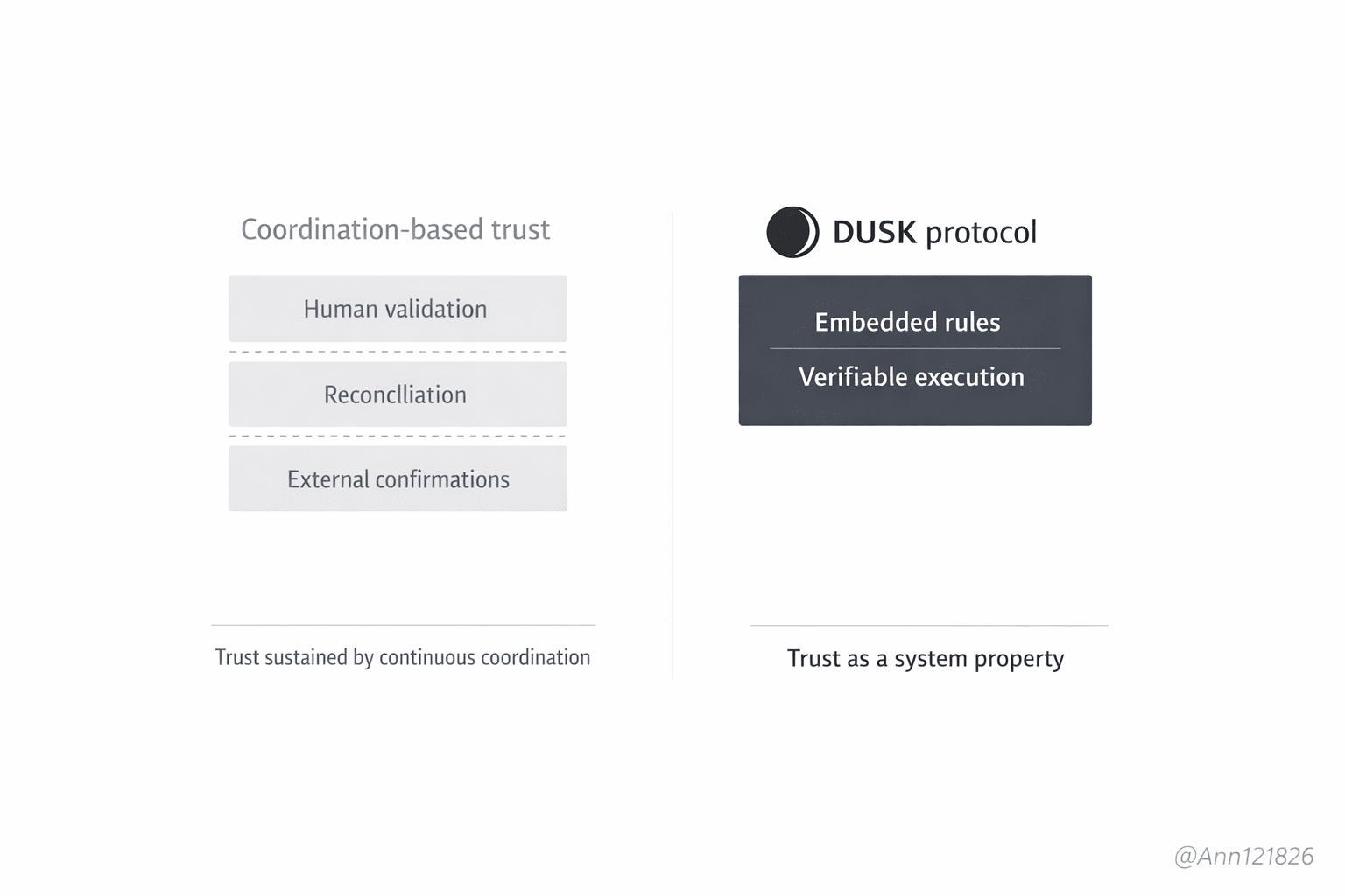DUSK não trata a confiança financeira como um acordo entre partes que deve ser sustentado por meio de coordenação constante. Na maioria dos sistemas financeiros, a confiança depende de sincronização humana, conciliações repetidas e validações cruzadas que só funcionam enquanto o uso é limitado. Quando a atividade se torna persistente e distribuída, a coordenação deixa de ser um suporte e se torna o principal ponto de falha do sistema.