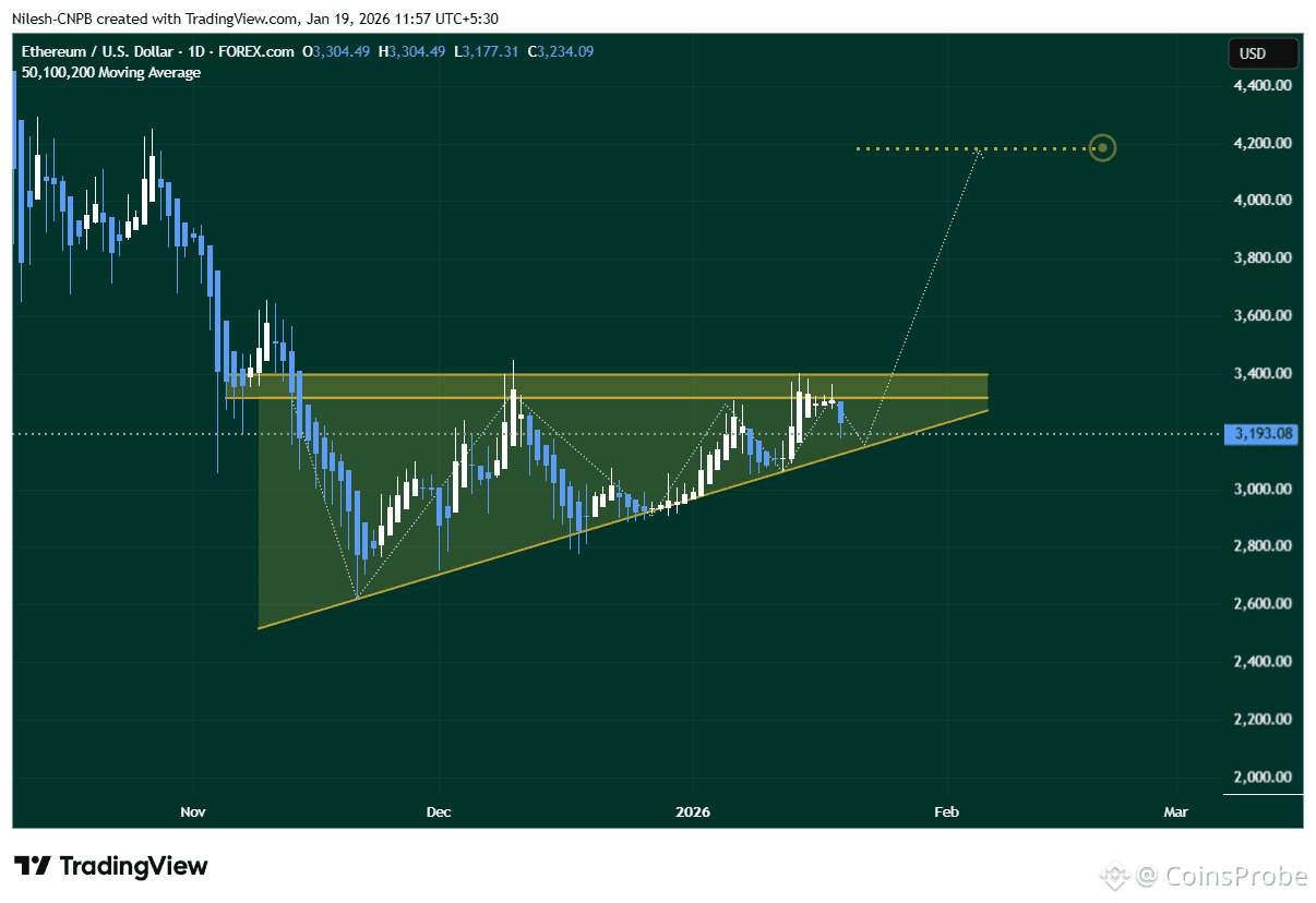 On the daily chart, Ethereum continues to trade within a well-defined ascending triangle pattern that has been forming since late 2025. This structure is characterized by higher lows rising steadily against a strong horizontal resistance zone around $3,400.