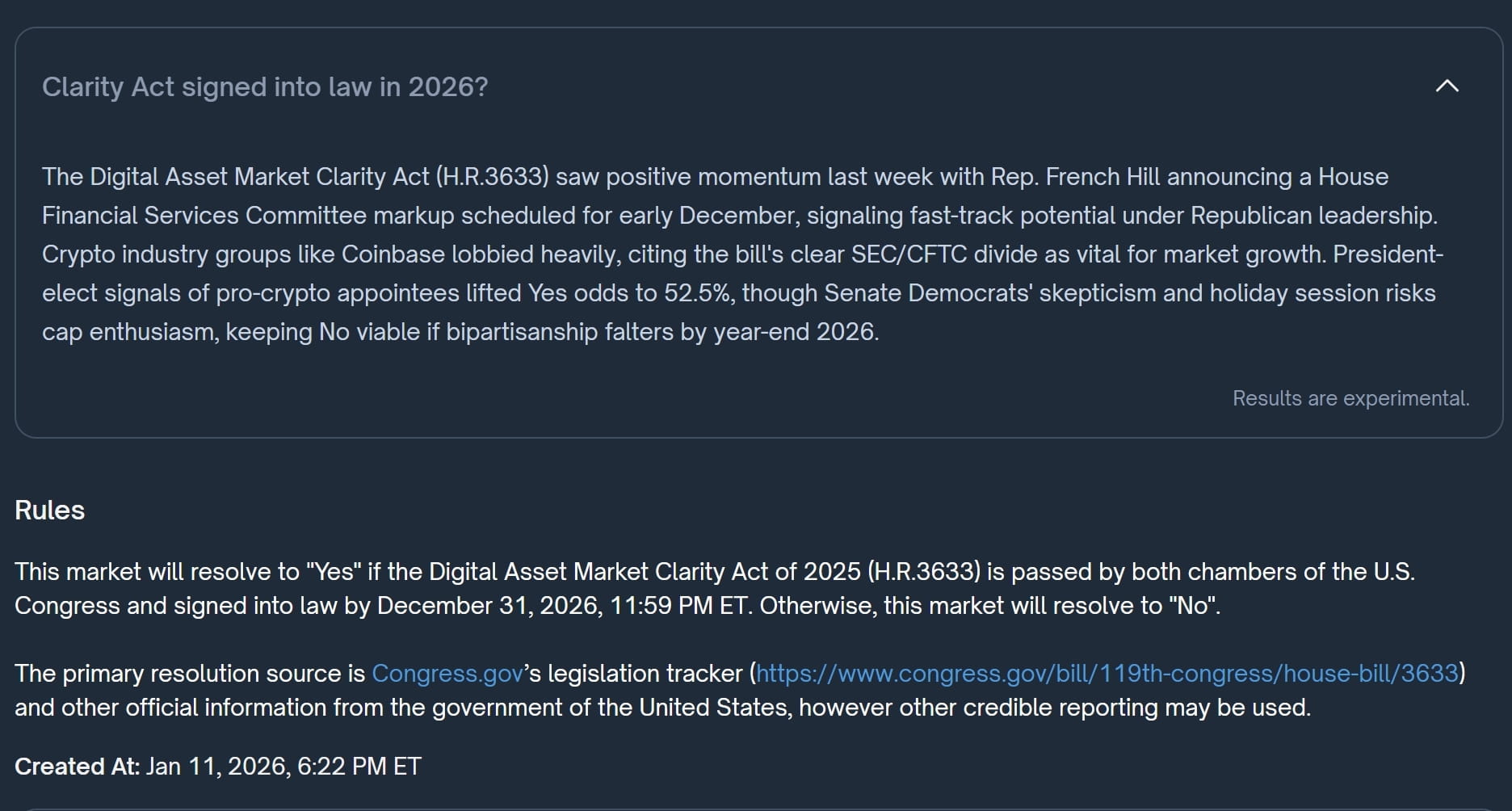 Este segundo artigo muda a lente de design de políticas para probabilidade. A questão não é mais se a Lei de Clareza é importante, mas se realmente se tornará lei — e se o mercado está precificando esse resultado corretamente. Essa questão agora está sendo ativamente negociada em mercados de previsão, onde os participantes são forçados a traduzir a complexidade legislativa em um resultado binário: Sim ou Não.
