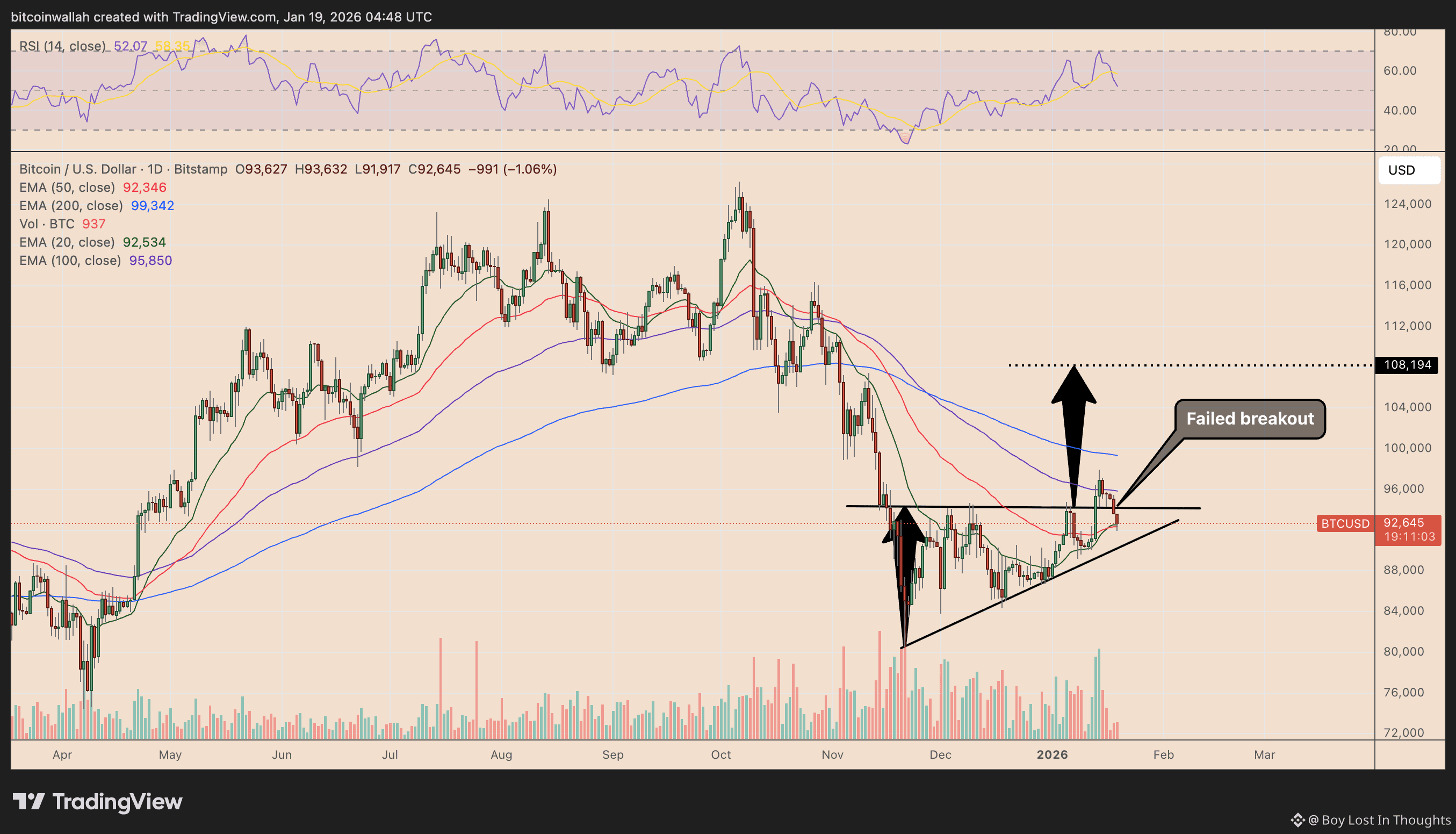 Bitcoin's price tumbled more than 1.8% to under $91,920, breaking a key bullish pattern that had pointed toward a surge past $100,000. The drop came as U.S. stock futures fell and safe-haven assets like gold rose—a sign of growing risk-off sentiment after former President Donald Trump threatened tariffs against several countries over Greenland. Analysts warn that a break below $90,000 could trigger deeper sell-offs, especially among ETF investors.