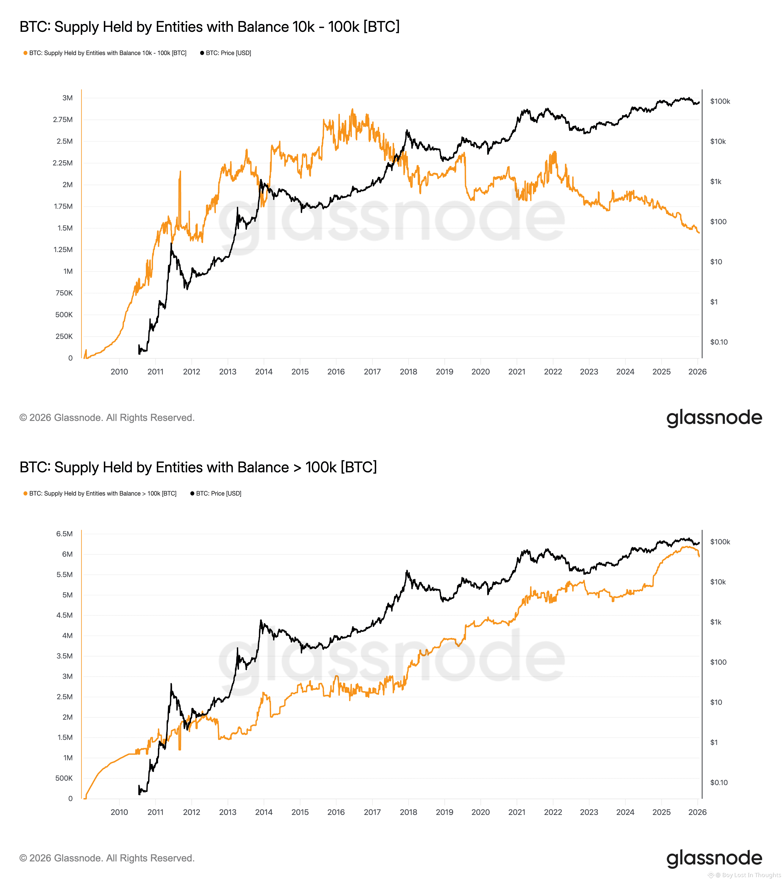 • Large holders (10,000+ BTC) are reducing their balances, signaling distribution, while mid-tier holders (1,000–10,000 BTC) are buying the dip.