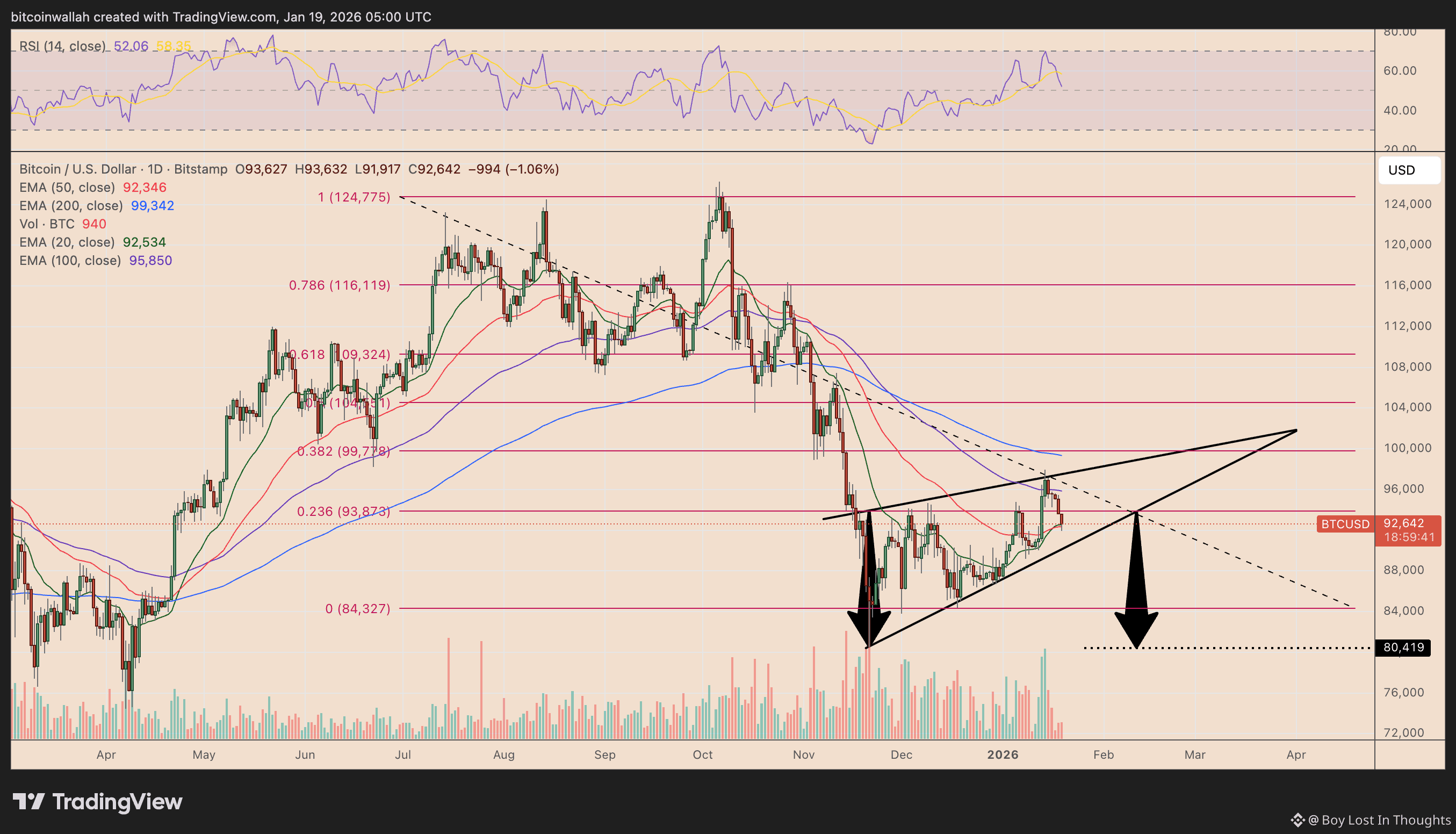 • A rising wedge pattern on the daily chart suggests weakening momentum and raises the risk of a drop toward $84,000–$80,000 if support fails.