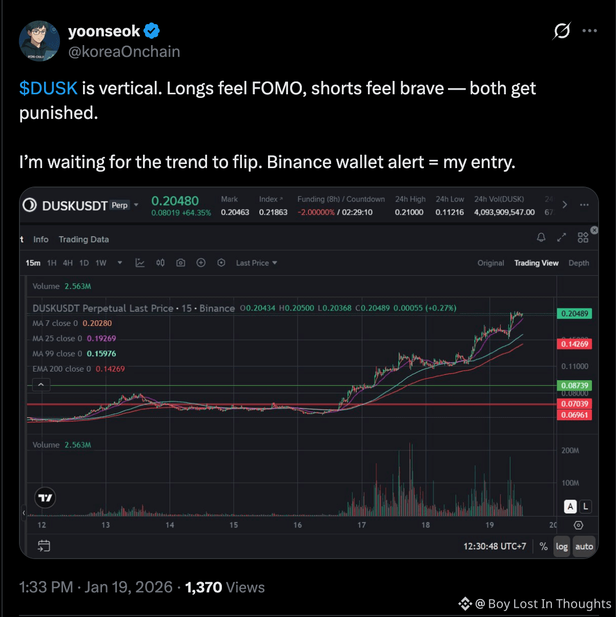 Rally Drivers: The boom started with investors seeking privacy-focused assets. DUSK, with its smaller market cap and thin liquidity, saw an outsized price move as it attracted speculative flows looking for the next laggard.