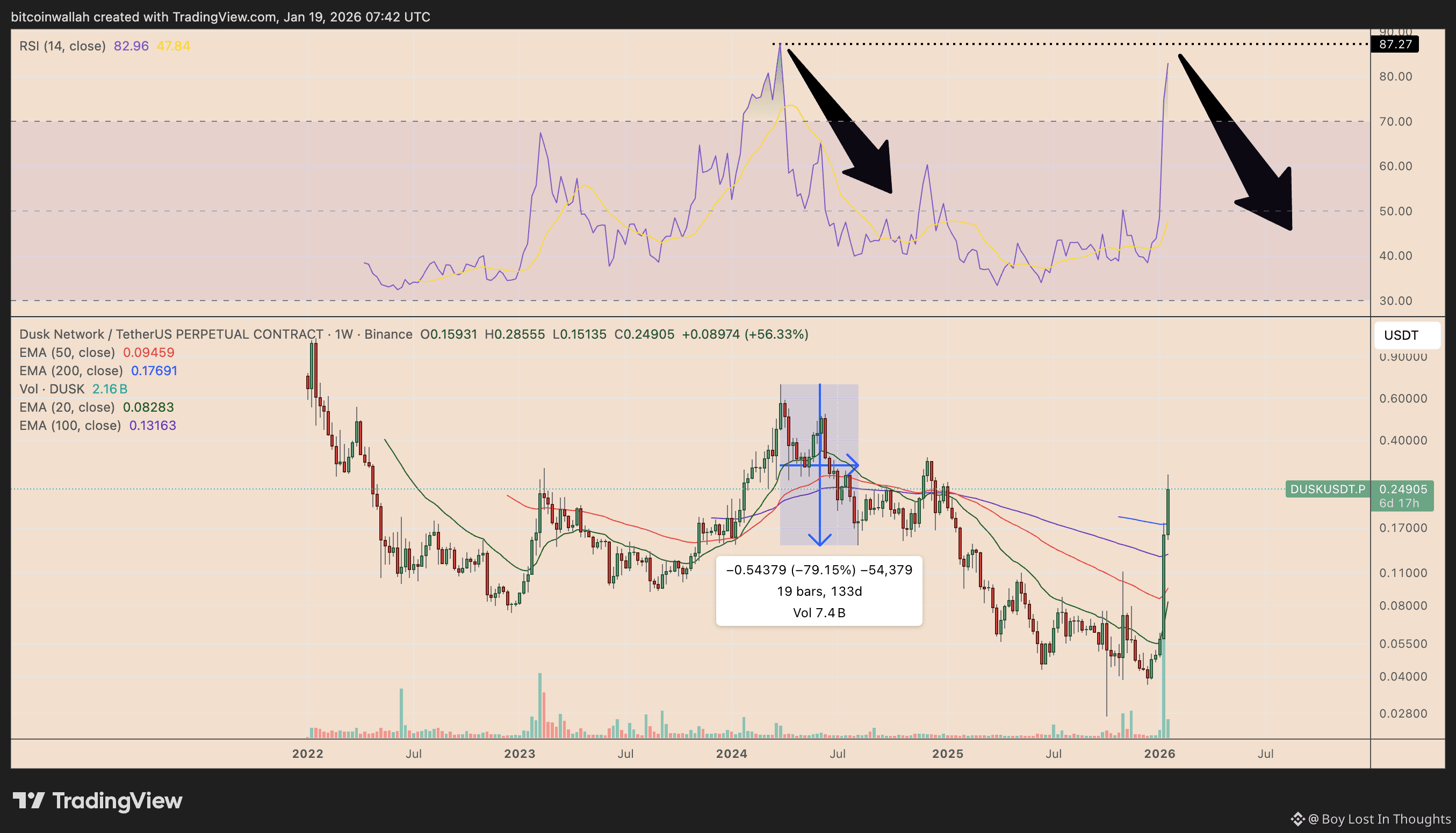 Extreme Overvaluation Warning: Technical indicators scream "overbought." DUSK's Relative Strength Index (RSI) is near 83 (well above the 70 danger threshold), a condition that preceded an ~80% crash in 2024.
