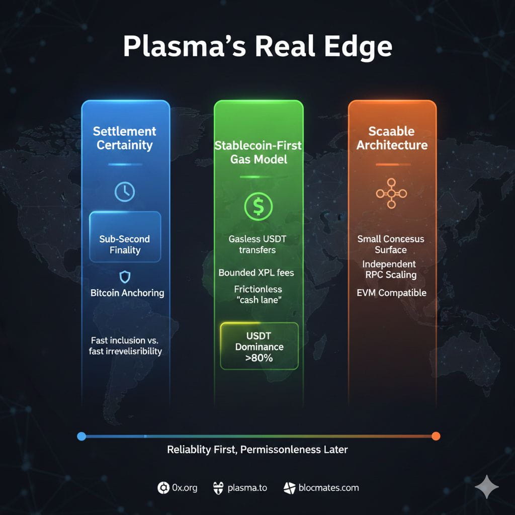 The cleanest way to understand Plasma is to stop treating it like another general-purpose Layer 1 and instead read it as a stablecoin settlement rail that happens to be EVM compatible. Most chains market throughput and hope payments “fit” later. Plasma starts from the realities of moving USDT at scale, fee friction, operational finality, and audit trails, then designs the chain around those constraints first. That’s why its choices feel less like crypto experimentation and more like a payments network that was rebuilt with programmable settlement as the default.