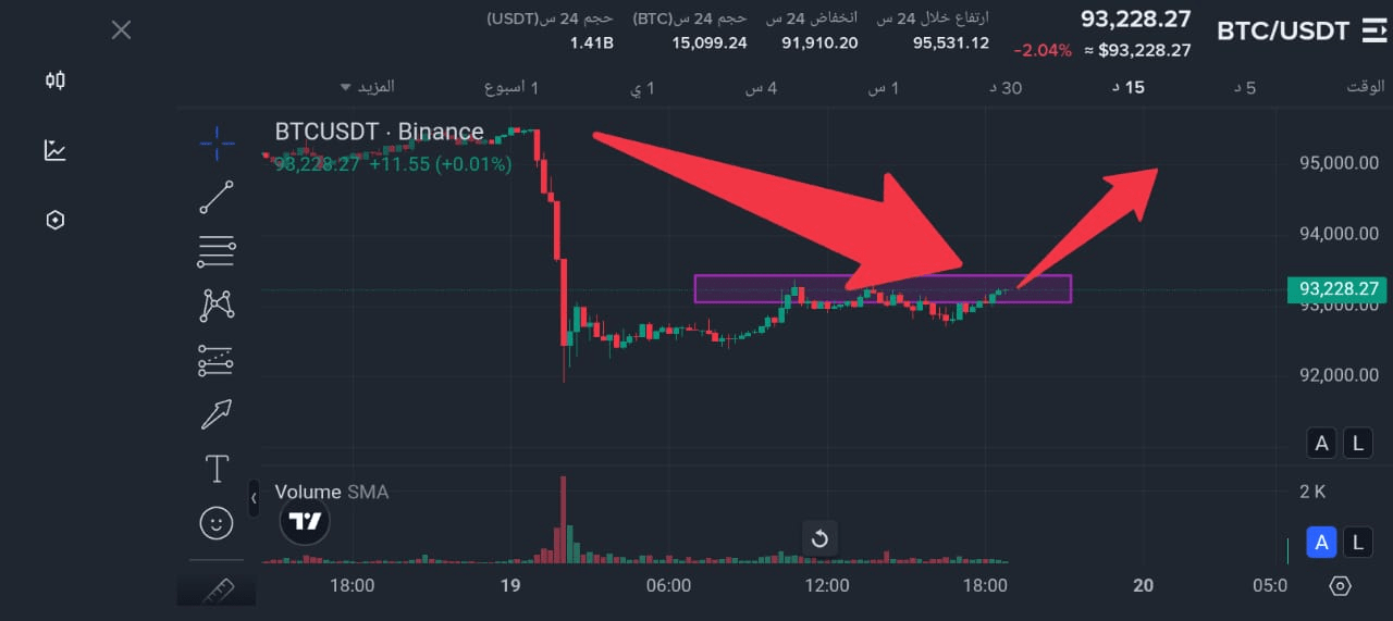 A "Zona Roxa" de Rompimento: O Bitcoin está atualmente testando um importante nível de resistência (destacado na caixa roxa). Um rompimento limpo acima de $93,500 deve desencadear uma onda de FOMO (Medo de Perder), fazendo com que o preço dispare em direção aos marcos de $95,000 e $98,000.