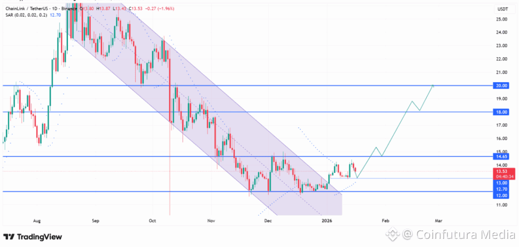 LINK has exited its previous downward trend and is now trading within a clearly defined range between $12 and $14.65. The controlled nature of past selling has given way to a more stable price behavior, with current trading around $13.53. The downward channel has broken, but the price remains bounded by the established horizontal range. The focus has shifted from trend continuation to condition building.