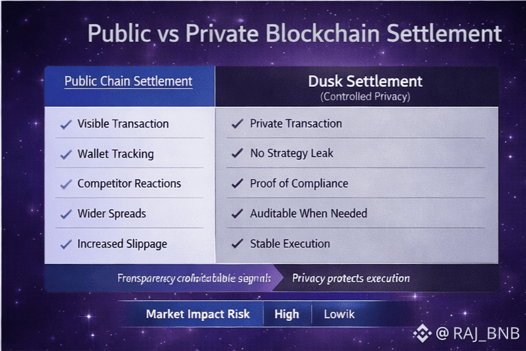 Public blockchains unintentionally broadcast sensitive information. Visible transactions expose wallet behavior, trading intent, and execution strategies, allowing competitors and arbitrageurs to react instantly. This leads to wider spreads, increased slippage, and higher market impact. Dusk addresses this through controlled privacy. Transactions remain private by default, protecting execution strategies, while still allowing proof of compliance and auditability when required. This removes the false trade-off between privacy and regulation.