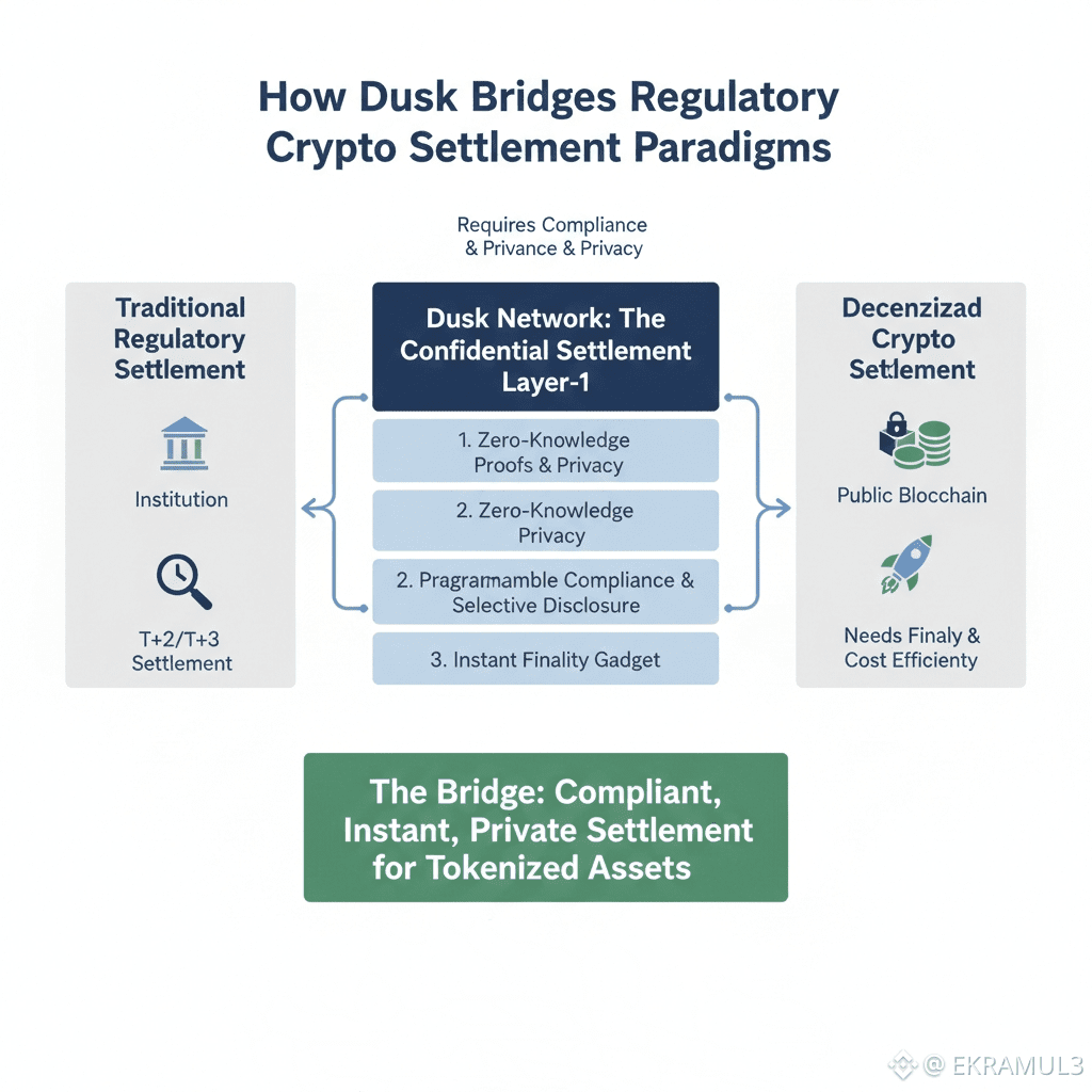 If you spend enough time studying why regulated assets have been slow to migrate on-chain, you eventually realize the bottleneck isn’t tokenization itself. Representing assets digitally is trivial. The hard part is settlement. In crypto, settlement is instantaneous and final. In regulated markets, settlement is layered, controlled, reversible in certain windows, and legally anchored. Dusk’s architecture exists at the intersection of these two worlds, acting as the bridge between crypto’s economic finality and regulation’s legal finality.