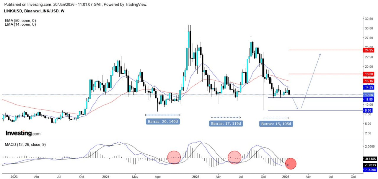 Após alcançar um máximo de $28 em agosto de 2025, LINK experimentou uma correção de aproximadamente 57%. O preço atualmente se consolida em torno do suporte estrutural crítico de $11,85. Este nível não apenas é um piso psicológico, mas também coincide com mínimos anteriores de importância, atuando como uma base potencial para uma nova fase de acumulação. O gráfico semanal mostra que, nas duas ocasiões anteriores em que o ativo perdeu sua média móvel de 50 sessões (MMA50), iniciou períodos de acumulação que duraram cerca de 120 dias antes de gerar um novo impulso altista sustentado.