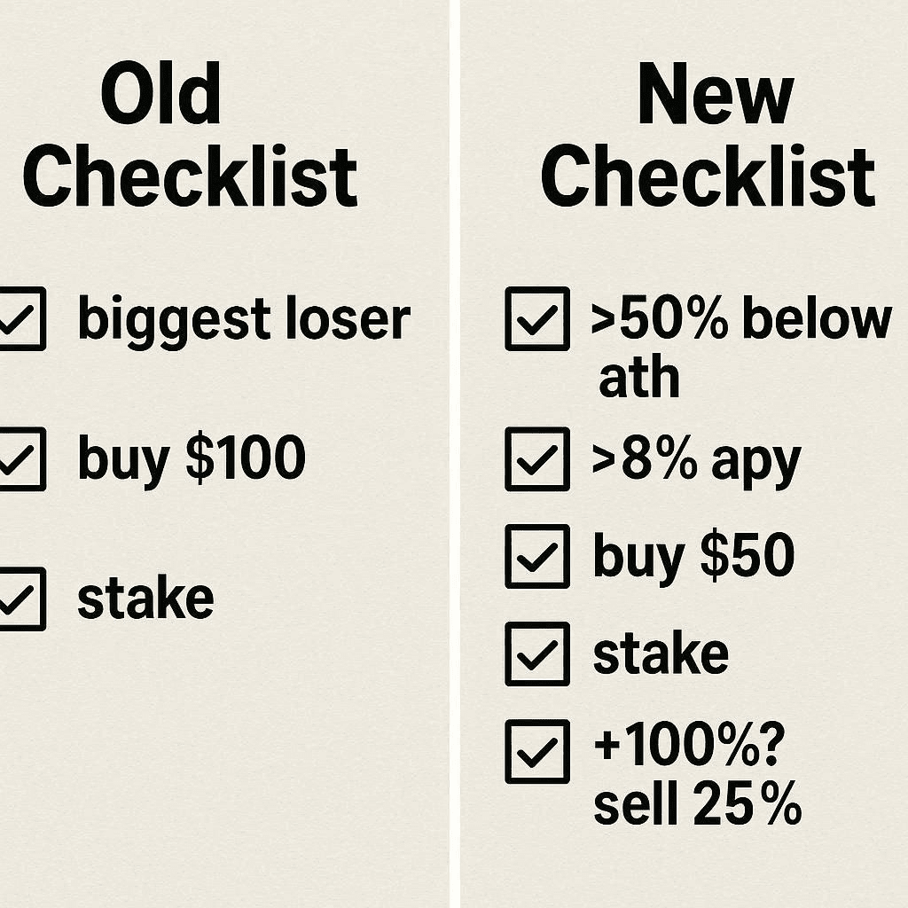 A Evolução: De compras sem cérebro para staking seletivo. O ritual de segunda-feira continua, mas de forma mais inteligente.