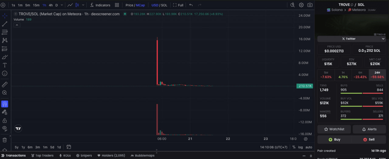 Logo após o TGE, o MC do Trove despencou de cerca de 900.000 USD para mais de 200.000 USD. O FDV atual é de apenas cerca de 300.000 USD, enquanto o volume de transações nas últimas 24 horas ainda está em torno de 130.000 USD, mostrando que a pressão de venda e as transações de curto prazo estão dominando.