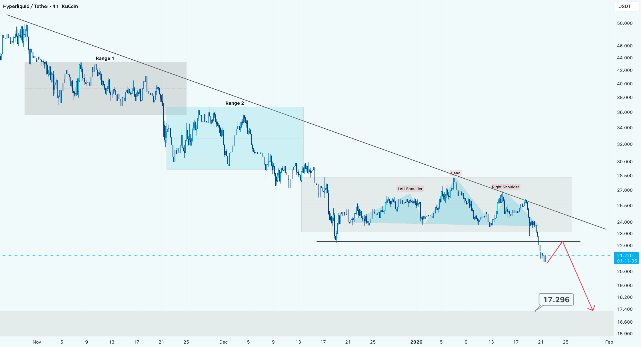 O suporte na linha do pescoço na área de 22,0 agora foi claramente rompido, confirmando a configuração de baixa.