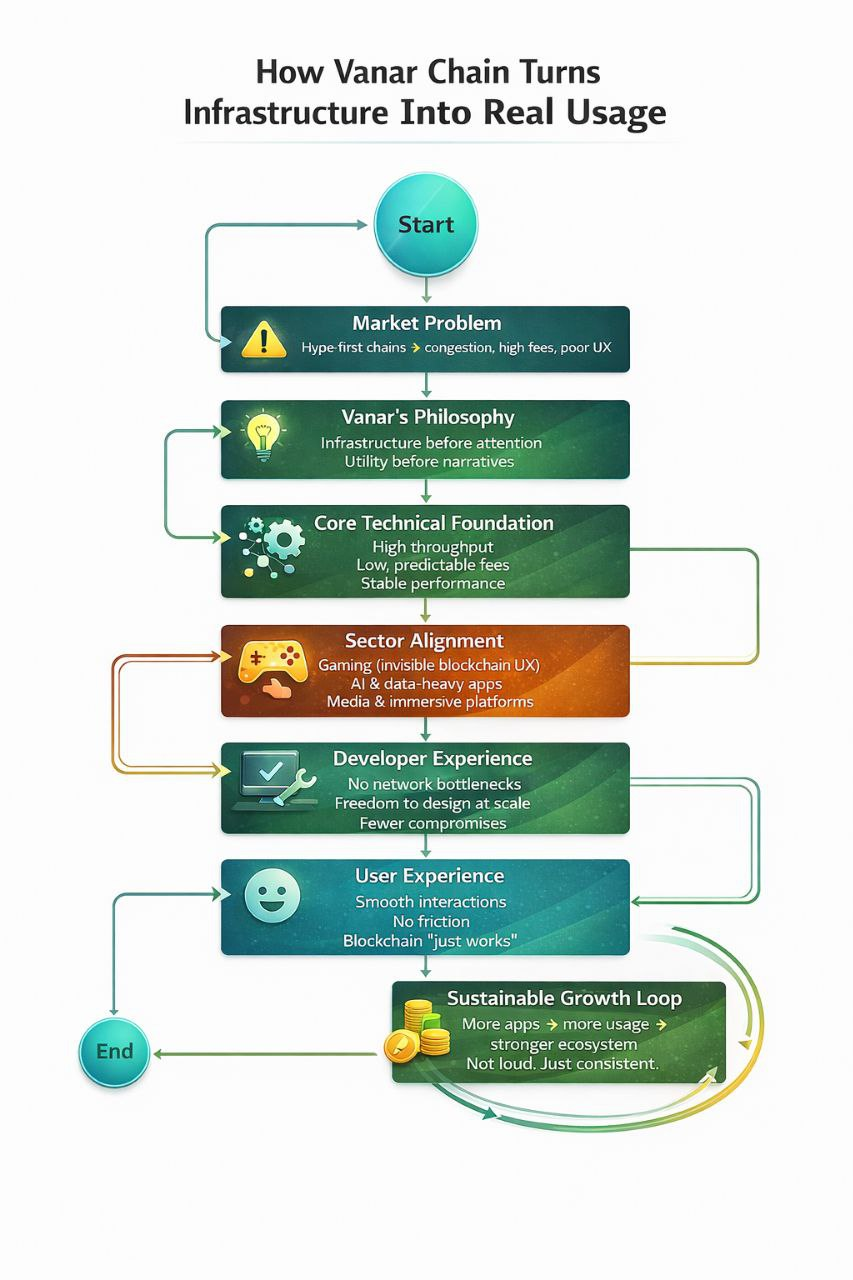 É por isso que @Vanarchain tem chamado minha atenção em silêncio. Vanar não está tentando dominar as manchetes. Em vez disso, está se concentrando nos fundamentos que importam muito depois que o hype desapareceu: velocidade, eficiência de custos e usabilidade no mundo real. Essas são as coisas que os desenvolvedores se preocupam quando estão construindo produtos destinados a escalar, e são as coisas que os usuários sentem quando uma blockchain simplesmente funciona sem atrito. Em um nível técnico, a Vanar Chain foi projetada para lidar com aplicações de alta capacidade enquanto mantém as taxas baixas e o desempenho consistente. Mas o que torna isso importante é como está sendo aplicado. Vanar claramente se alinhou com setores onde a infraestrutura de blockchain realmente precisa funcionar: jogos, experiências digitais imersivas, aplicações integradas de IA e plataformas de mídia.