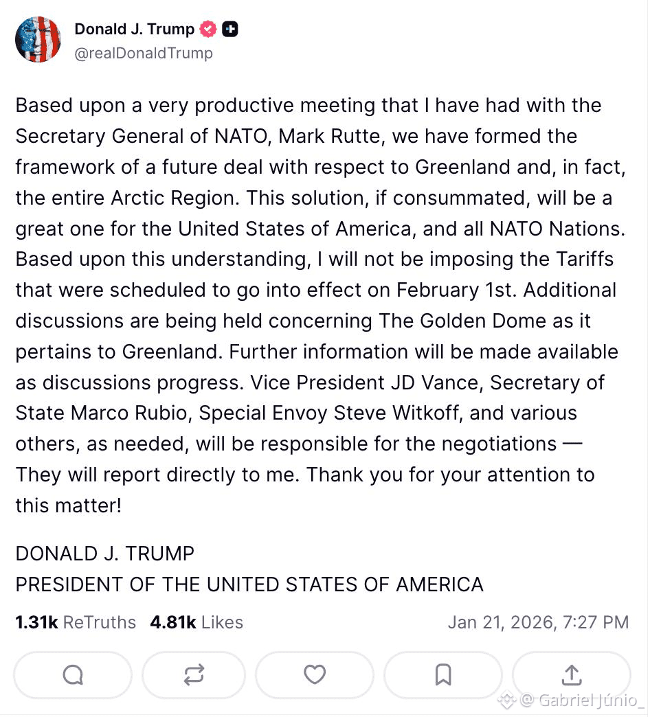"Com base em uma reunião muito produtiva que tive com o Secretário-Geral da OTAN, Mark Rutte, definimos a estrutura de um futuro acordo referente à Groenlândia e, na verdade, a toda a região do Ártico. Essa solução, se concretizada, será excelente para os Estados Unidos da América e para todos os países da OTAN. Com base nesse entendimento, não imporei as tarifas que entrariam em vigor em 1º de fevereiro. Discussões adicionais estão sendo realizadas a respeito da Cúpula Dourada, no que diz respeito à Groenlândia. Mais informações serão disponibilizadas conforme o andamento das discussões. O Vice-Presidente JD Vance, o Secretário de Estado Marco Rubio, o Enviado Especial Steve Witkoff e outros, conforme necessário, serão responsáveis pelas negociações — e se reportarão diretamente a mim. Agradeço a atenção dispensada a este assunto