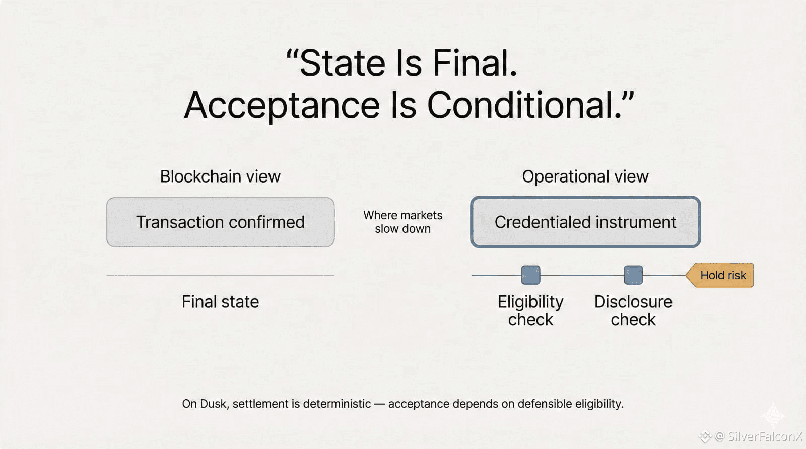 The asset sits where it last qualified. Not frozen. Not rejected. Just unfinished. And until the posture matches the context again, it stays that way... while everything else on Dusk keeps moving as if nothing happened.