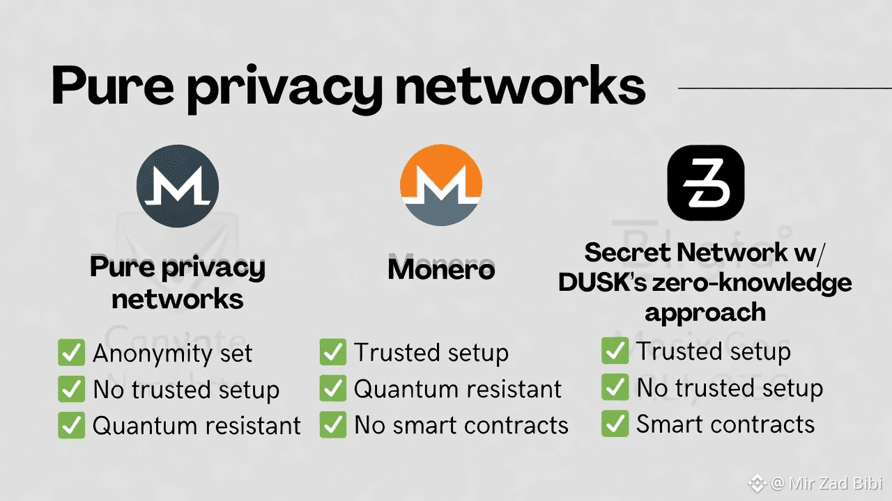 Pure privacy networks highlight yet another contrast. Monero prioritizes anonymity above all else. Secret Network relies on trusted hardware environments, which come with their own assumptions and risks. DUSK’s zero-knowledge approach avoids those hardware dependencies, but it isn’t free. The system is heavier, more complex, and more demanding to build on. These networks aren’t interchangeable; they solve different problems for different users.