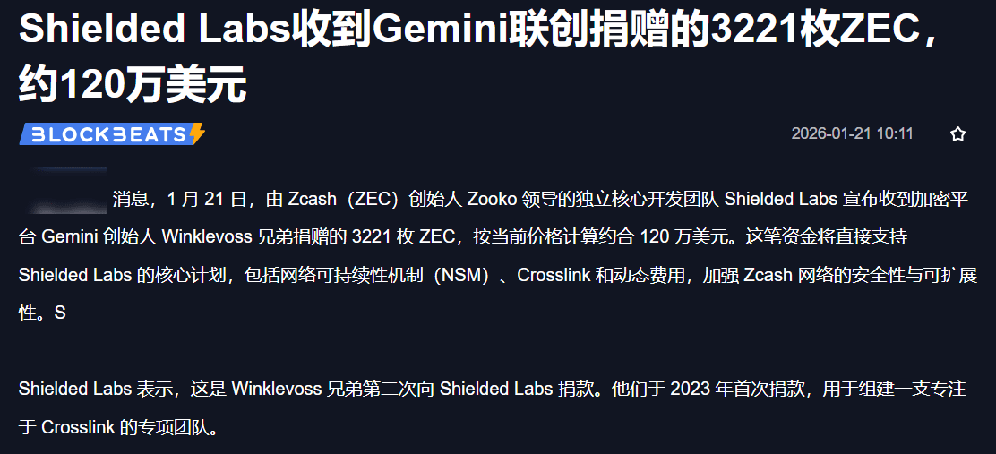 消息面:3221枚ZEC的"黄金雨"