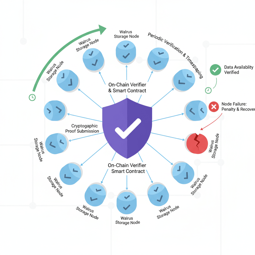 Em vez de confiar que os provedores de armazenamento se comportem de maneira honesta, o Walrus exige que eles provem que realmente estão mantendo os dados. Essas provas são geradas regularmente e podem ser verificadas de forma independente. Se um provedor falhar em produzir provas válidas, o sistema detecta isso cedo, muito antes de os dados se tornarem irrecuperáveis.