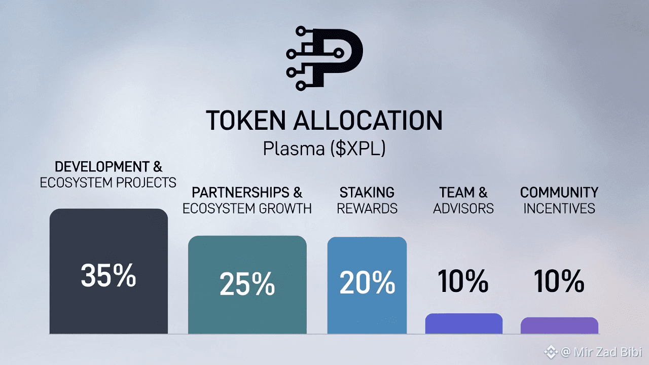 Plasma ($XPL) steps into that space with a design meant to address these exact issues. The total supply is capped at 1 billion tokens, which is a simple way of keeping inflation in check. But it’s more than just a number. The allocation of $XPL is deliberate: development and ecosystem projects get 35% to fund upgrades, security checks, and ongoing improvements; 25% goes toward partnerships and ecosystem growth, helping attract integrations and liquidity; 20% is set aside for staking rewards, giving people a reason to hold and secure the network; 10% is for the team and advisors, structured to make sure they stay committed; and 10% is for community incentives—early adopters, contributors, and governance participants. All of it is designed to keep the network alive and balanced.