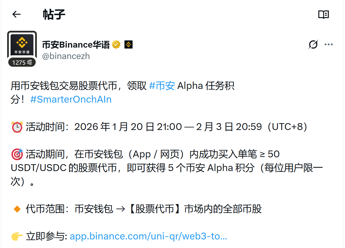 Recentemente, a carteira da Binance também lançou uma atividade, usando a carteira da Binance para negociar ações americanas você pode ganhar 5 pontos de fidelidade da Binance Alpha.(na carteira da Binance — convide amigos inserindo o código de convite: WLW8LF9W,clique aqui para desfrutar de um desconto de 30% nas taxas)