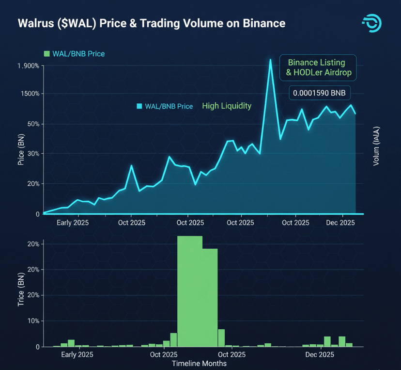 Um forte indicador de adoção e interesse institucional surgiu quando a Binance incluiu a WAL como o 50º projeto em seu programa HODLer Airdrop em 10 de outubro de 2025. Usuários que mantiveram e fizeram staking de BNB em programas de ganhos específicos da Binance eram elegíveis para recompensas de tokens WAL, destacando o endosse da Binance e trazendo o token a uma ampla audiência global. A WAL foi listada para negociação com pares incluindo USDT, USDC, BNB e outros.