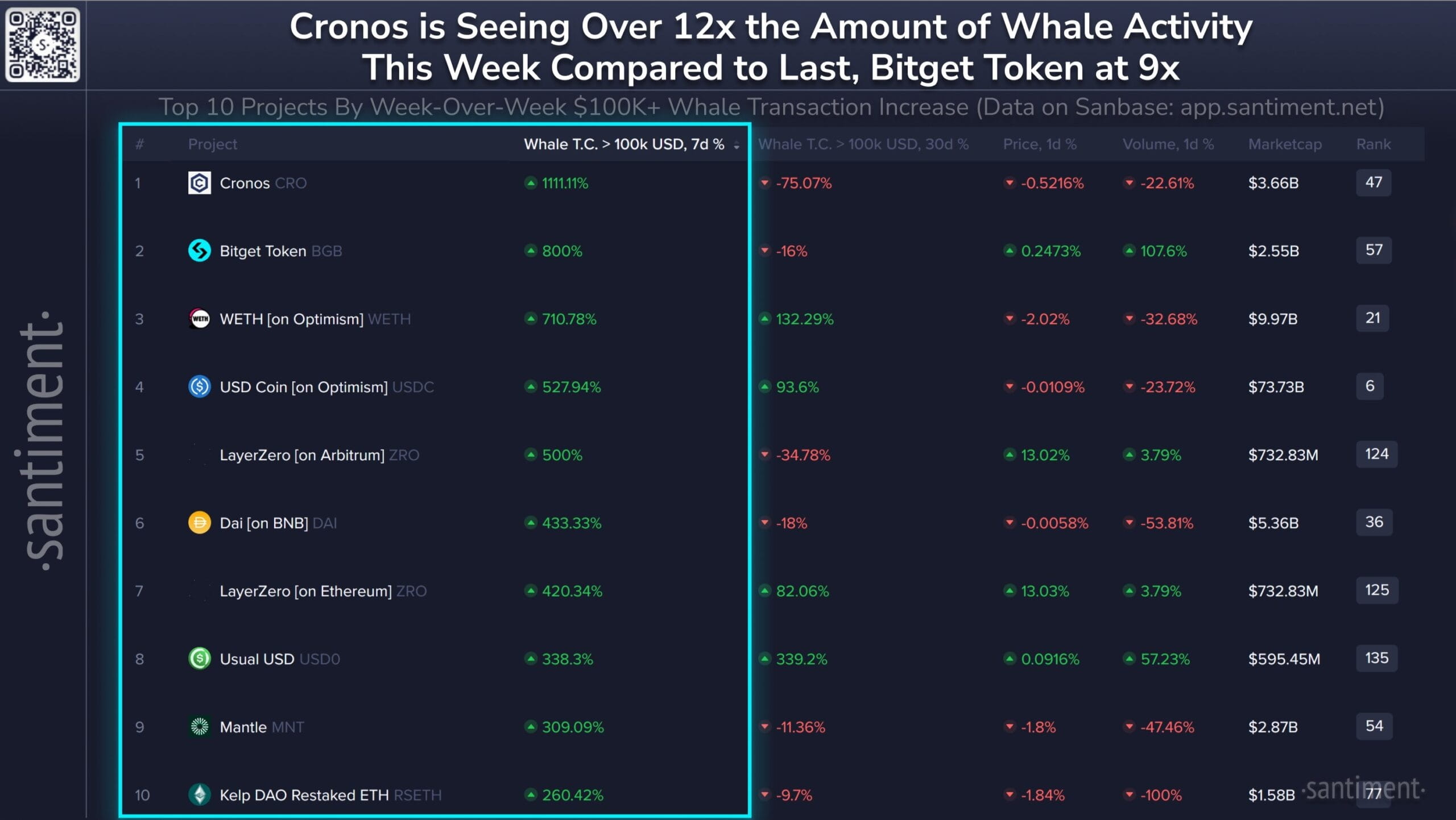 Nos últimos 7 dias, transações de CRO acima de $100.000 aumentaram mais de 1.100%, fazendo de Cronos o projeto mais classificado em termos de crescimento da atividade de baleias semanal. Esse pico superou significativamente outros tokens de grande capitalização, com até mesmo o Bitget Token (BGB) — classificado em segundo — mostrando um aumento comparativamente menor.