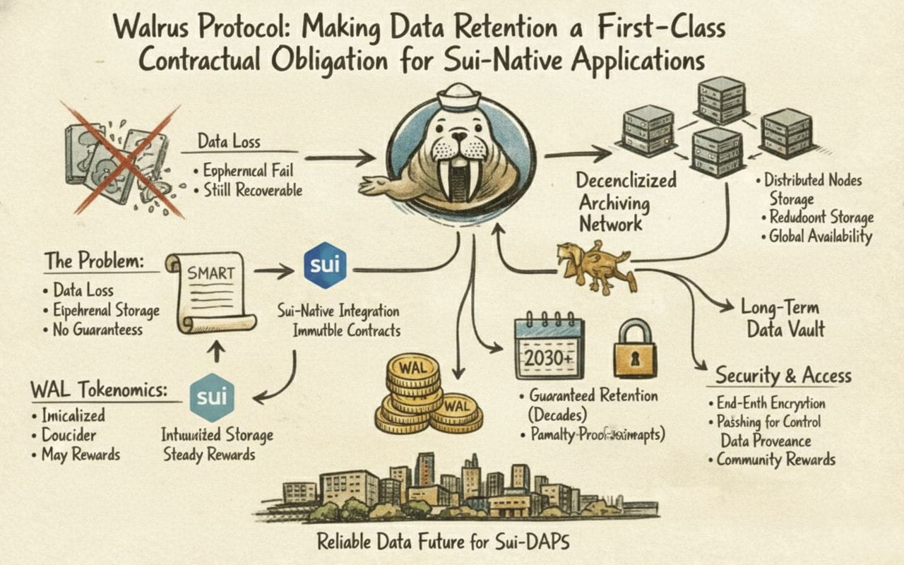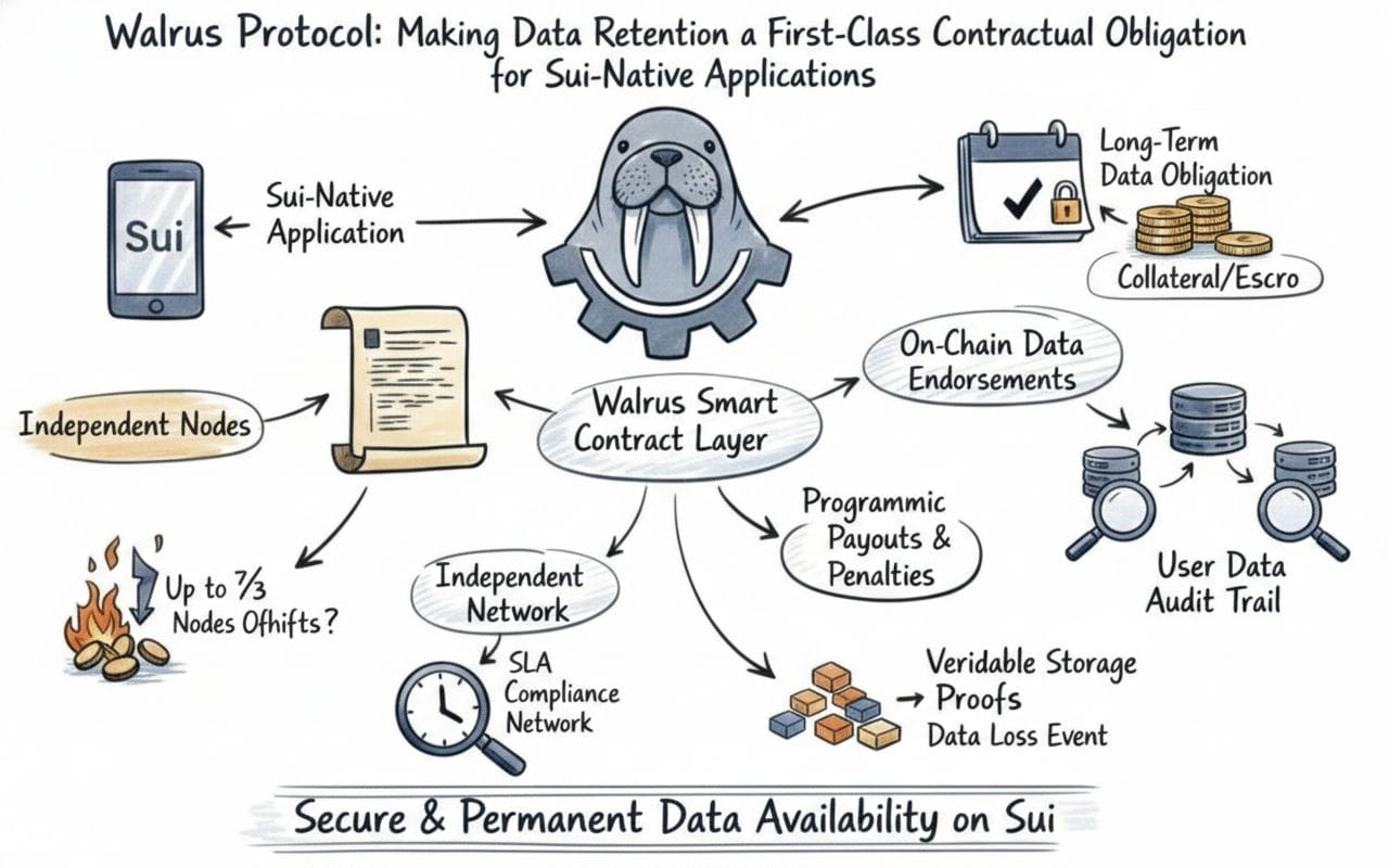 A morsa quebra esse modelo. No Sui, a retenção de dados se torna uma obrigação contratual em vez de uma suposição educada. As aplicações não “esperam” que seus blobs existam mais tarde; elas alocam retenção da mesma forma que alocam computação. O protocolo transforma a persistência em um requisito rigoroso com ciclo de vida explícito, provas verificáveis e responsabilidade econômica.