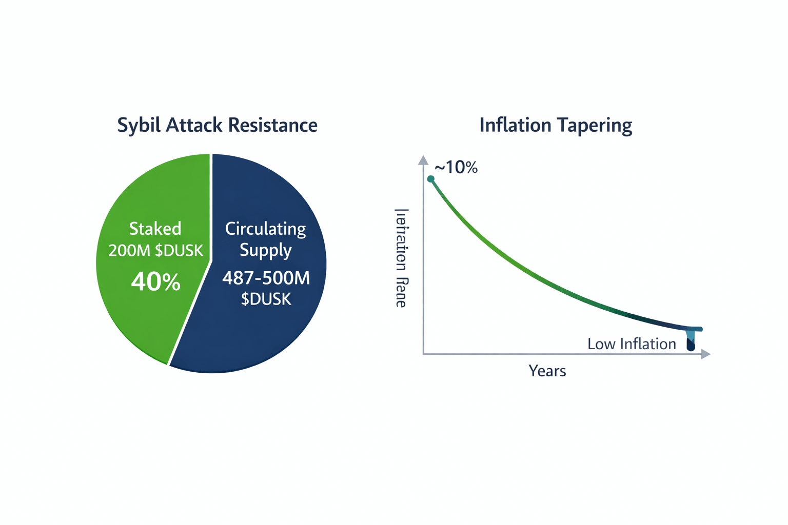 Então há o sistema ContractStake. Aqui, $DUSK detentores bloqueiam tokens para se tornarem Provisionadores, protegendo ativamente a rede. A partir de meados de janeiro de 2026, mais de 200 milhões de $DUSK—cerca de 40% do suprimento total—estão em staking. Isso é um escudo maciço contra ataques Sybil. O protocolo penaliza qualquer um que tente trapacear ou relaxar, e recompensa aqueles que ajudam a manter as coisas funcionando suavemente. Não é apenas um investimento passivo; os stakers ajudam a governar atualizações, votando em tudo, desde limites de gás até requisitos de nós. A comunidade está no comando, e isso é evidente. Com um suprimento limitado de 1 bilhão e inflação caindo para cerca de 10% ao ano, o sistema queima taxas para manter a inflação sob controle e dificultar ainda mais os ataques. Realisticamente, um ataque de 51% custaria tanto que simplesmente não valeria a pena tentar. Além disso, o design modular do Dusk significa que as correções são implementadas suavemente, sem o caos das bifurcações.