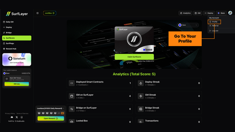O Perfil SurfScore é onde toda a sua jornada onchain no SurfLayer se reúne.