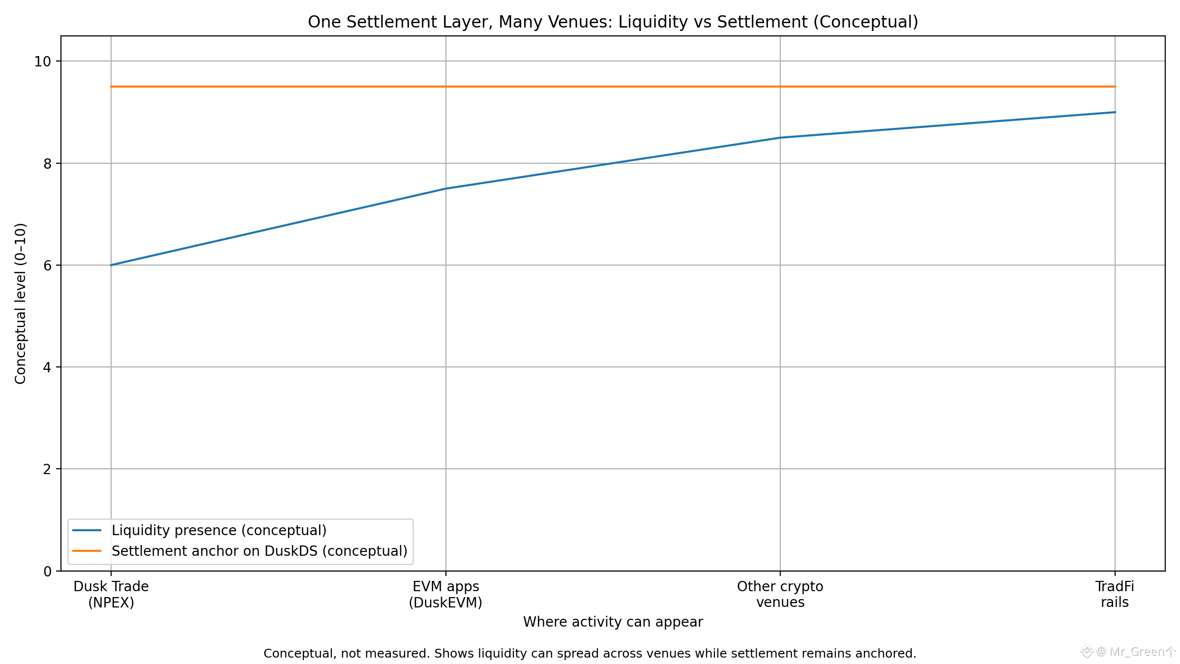 If a regulated venue can issue or list compliant instruments, and those instruments settle on DuskDS, then Dusk can aim for a world where issuance and settlement are consistent even as liquidity appears in different execution contexts. Dusk Trade becomes one venue where those assets can be accessed. DuskEVM becomes another venue type, because it can host Solidity applications that interact with those assets while still settling to DuskDS. And beyond that, the broader market reality still holds: liquidity can express itself across many places—crypto venues, wallet interfaces, and traditional market rails—while the “official” issuance and settlement record remains anchored.